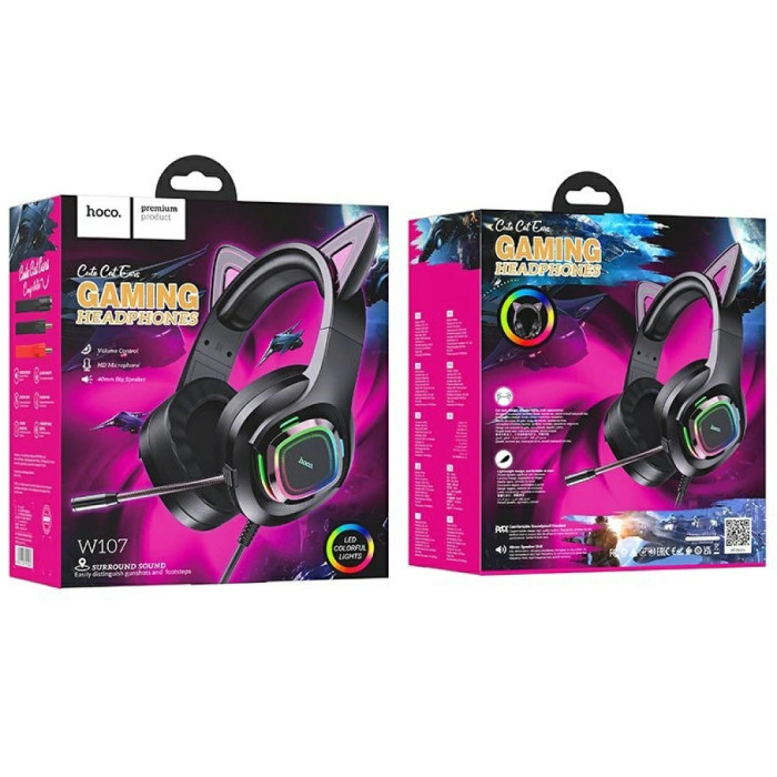 HOCO W107 Cute cat luminous cat ear gaming headphones Phantom Cat — це ігрові навушники, розроблені таким чином, щоб обіймати вухо, повністю накривати його, забезпечуючи комфорт і достатню шумоізоляцію від навколишнього середовища.Навушники оснащені технологією об’ємного звуку, яка дає відчуття, що звук оточує вас, і дозволяє легше почути напрямок руху союзників або супротивників в ігровому процесі.Навушники Hoco W107 оснащені дуже м'якими накладками на вуха, тому не завдають ніякого дискомфорту. Розмір навушників – універсальний, модель виконана у молодіжному дизайні з вушками та підсвічуванням.
