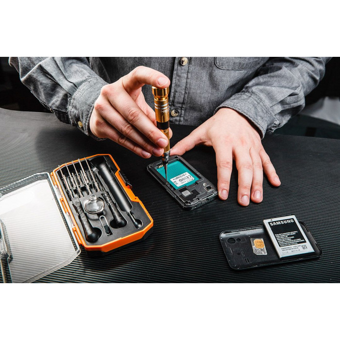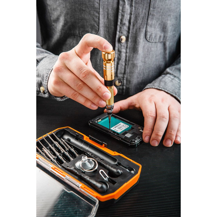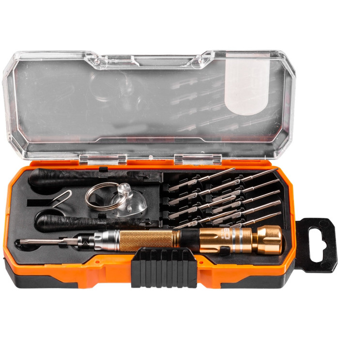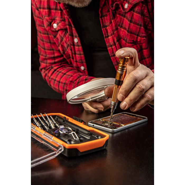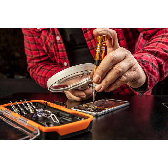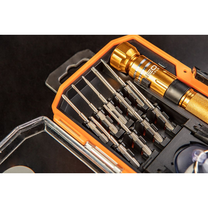 Набір для ремонту смартфонів NEO складається з 10 насадок, котрі підходять до найпопулярніших на ринку моделей смартфонів. Крім того, є лопатки, що дозволяють відкривати корпус без пошкоджень, а також присоска, для зручного зняття скла та поворотний тримач викруткових наконечників, що полегшує роботу. Бренд NEO виправдовує очікування професіоналів.