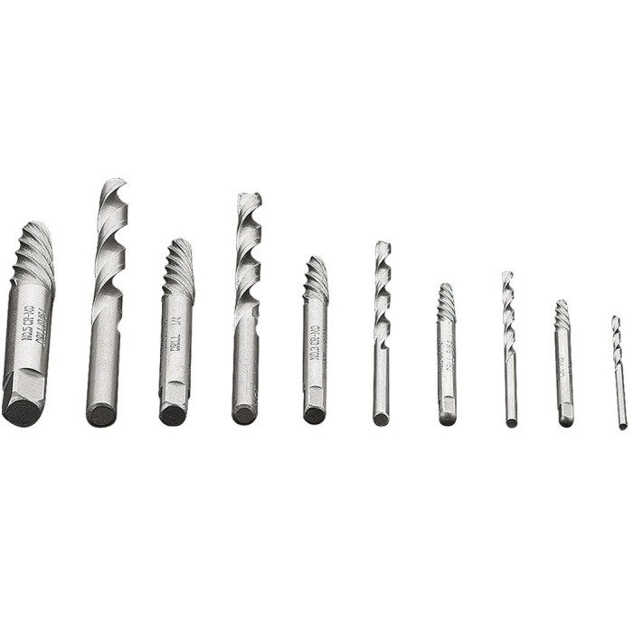 Знімачі для зламаних гвинтів з пілотними свердлами, набір з 10 штук. 09-609 від NEO - це набір з десяти штук викруток з розмірами для гвинтів: 2, 3, 4, 6,5 , 7,5 мм. Рекомендуються для пошкоджених шурупів, які важко відкрутити.