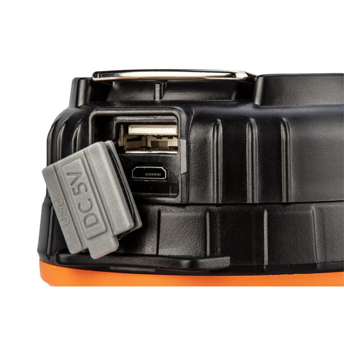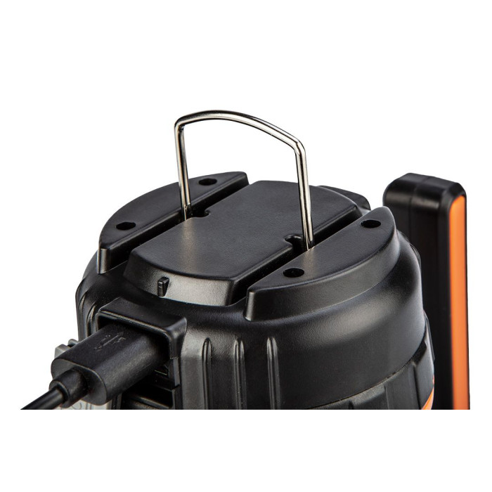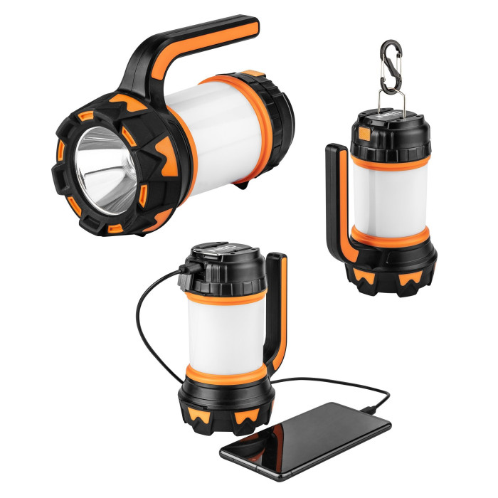 Кемпінгова лампа NEO, що перезаряджається, 3 в 1: лампа, ліхтар і "power bank". 4 функції освітлення: ліхтар, бічне світло, червоне бічне світло та червоний бічний стробоскоп. Ліхтар оснащений світлодіодами CREE T6 та SMD, зі світловим потоком 800 люмен та потужністю 10 Вт. Живлення ліхтаря здійснюється від літій-іонного акумулятора, що входить в комплект, 2 шт., 3.7 В і ємністю 1200 мАг.