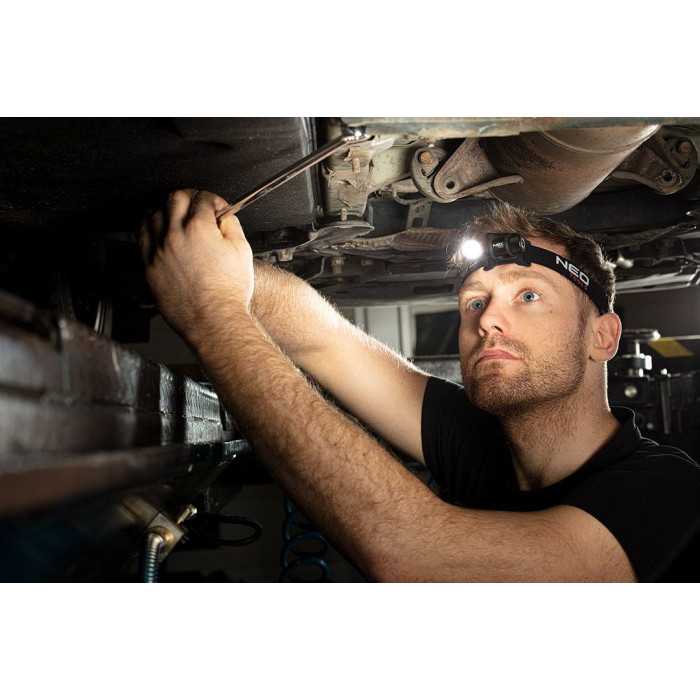 Потужний (600 люмен) налобний ліхтар NEO оснащений висококласним світлодіодом LED CREE XPG3 потужністю 6 Вт. Корпус виконаний із алюмінію. Ліхтар має 4 функції освітлення 100%/40%/10%/стробоскоп. Фару можна зняти з корпусу та використовувати як ліхтарик. Ліхтар поставляється із обручем на голову. Має широкий спектр застосування, у тому числі в майстерні, для електрика, сантехніка, у поході, під час поїздок, під час занять спортом тощо. Відповідність європейським стандартам безпеки підтверджено сертифікатом CE.