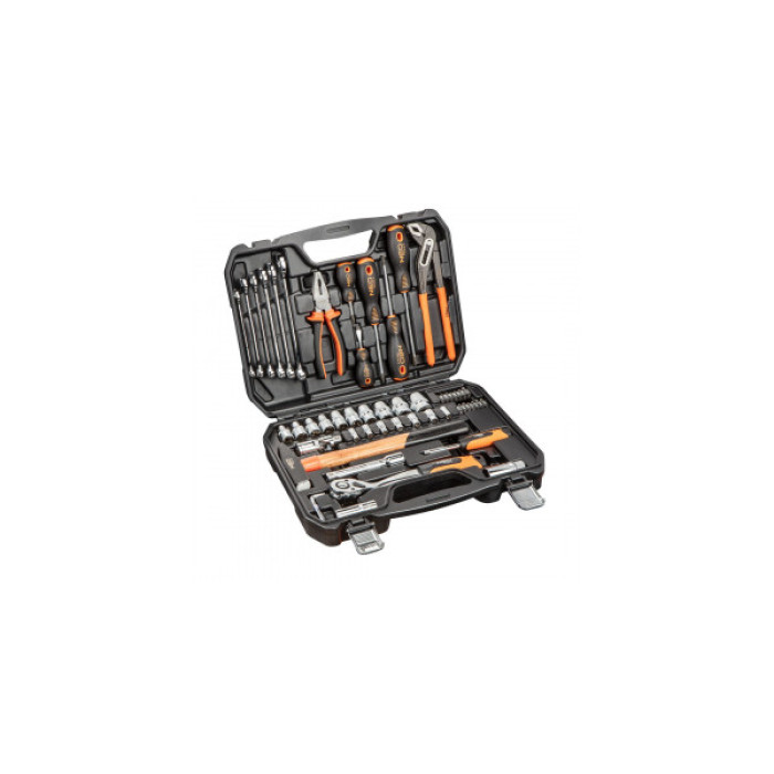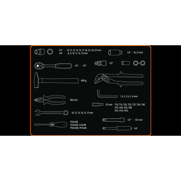 торцеві головки, шарнірно-губцевий інструмент, викрутки, шестигранні / зіркоподібні ключі, молоток, подовжувач, вороток, перехідник, шарнір, змінні наконечники, ключ тріскачковий, кейс, рожково-накидні ключі