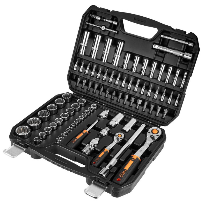 Neo Tools Набір інструментів, набір торцевих головок, 86шт, 1/2", 1/4", CrV, кейс