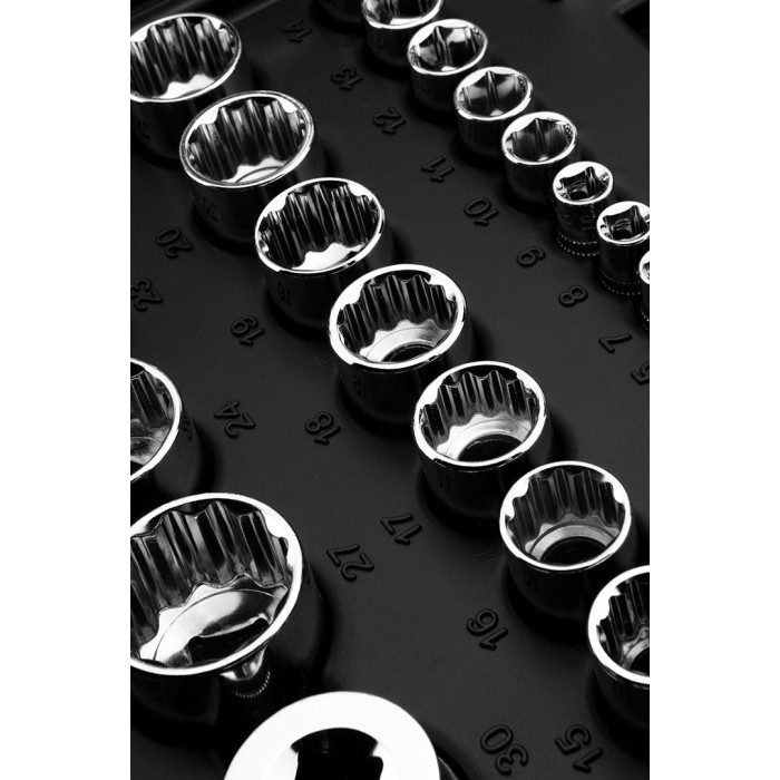 торцеві головки/(1/2", шестигранні, 15 шт.: 10, 13, 15, 16, 17, 18, 19, 20, 21, 22, 23, 24, 27, 30, 32 мм; 1/2", довгі шестигранні головки, 4шт.: 14, 15, 17, 19 мм; 1/2", свічкові: 16 мм та 21 мм; 1/4", шестигранні головки, 14 шт: 4, 4.5, 5, 5.5, 6, 6.5,