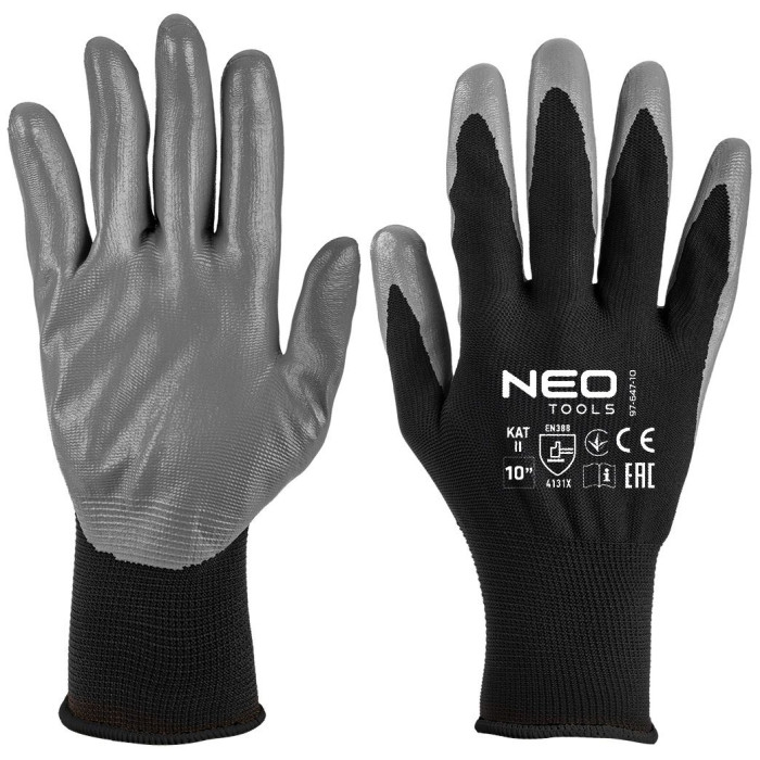 Робочі рукавички 97-647-11 від NEO TOOLS - це міцні та довговічні рукавички з поліестеру з нітриловим покриттям (гладкі), які підходять для широкого спектру застосування - транспортні роботи, садівництво, будівництво, переміщення та зберігання, складальні роботи, виробництво дрібних деталей, DIY та автомобілебудування.