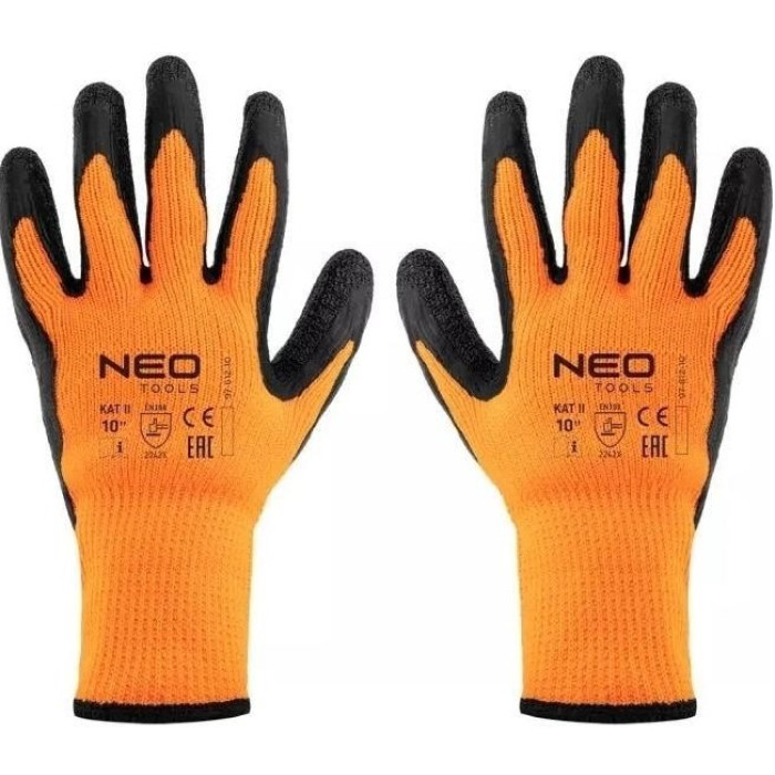 Утеплені робочі рукавички NEO розміру 10, поліестер з латексним покриттям, 2242X 97-612-10, виготовлені з поліестеру з латексним покриттям. Вони мають високу стійкість до зносу (від 0 до 4) 2, стійкість до порізів гострими предметами (від 0 до 5) 2, стійкість до розривів (від 0 до 4) 4 та стійкість до проколів (від 0 до 4) 2. Вони також відрізняються стійкістю до порізів відповідно до EN ISO 13997 X. Рукавички добре сидять на руці. Вони можуть використовуватися для всіх видів транспортування, переміщення, зберігання, складальних робіт, виробництва дрібних деталей, DIY, автомобілебудування та садівництва. Вони захищають руки від холоду, бруду, подряпин, відбитків та шкідливих умов праці. При правильній конструкції - запобігає вислизанню інструментів з рук. Знак CE щодо відповідності стандарту EN 388, 22242X – це гарантія безпеки, яка доводить, що продукт марки NEO відповідає всім вимогам CE.