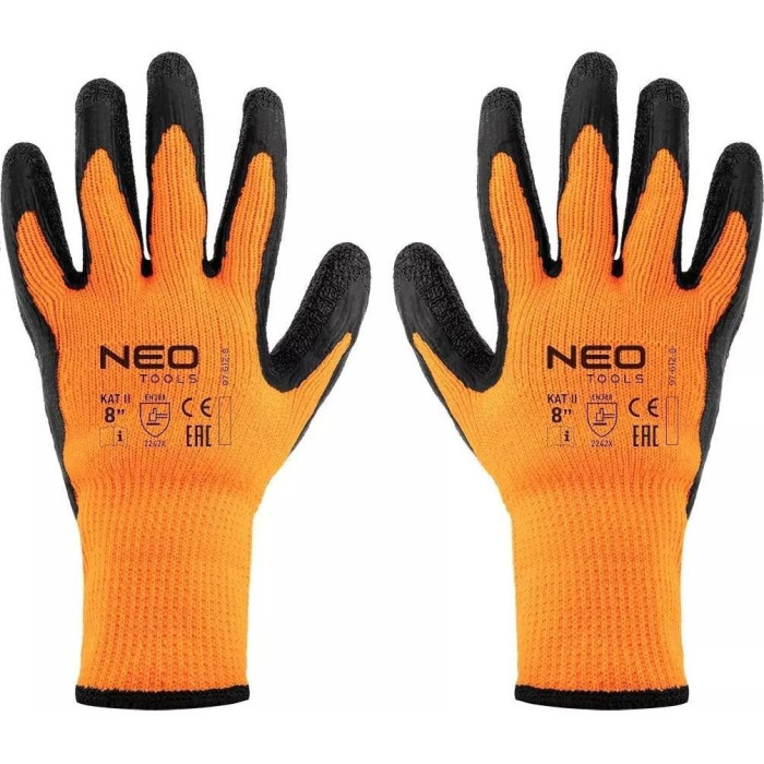 Утеплені робочі рукавички NEO розміру 8, поліестер з латексним покриттям, 2242X 97-612-8, виготовлені з поліестеру з латексним покриттям. Вони мають високу стійкість до зносу (від 0 до 4) 2, стійкість до порізів гострими предметами (від 0 до 5) 2, стійкість до розривів (від 0 до 4) 4 та стійкість до проколів (від 0 до 4) 2. Вони також відрізняються стійкістю до порізів відповідно до EN ISO 13997 X. Рукавички добре сидять на руці. Вони можуть використовуватися для всіх видів транспортування, переміщення, зберігання, складальних робіт, виробництва дрібних деталей, DIY, автомобілебудування та садівництва. Вони захищають руки від холоду, бруду, подряпин, відбитків та шкідливих умов праці. При правильній конструкції - запобігає вислизанню інструментів з рук. Знак CE щодо відповідності стандарту EN 388, 22242X – це гарантія безпеки, яка доводить, що продукт марки NEO відповідає всім вимогам CE.