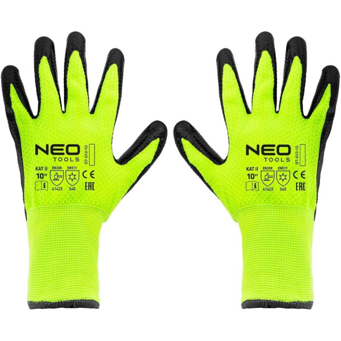 Утеплені робочі рукавички NEO розміру 10, нейлон з латексним покриттям, 4142X 97-613-10, виготовлені з нейлону з латексним покриттям. Вони мають високу стійкість до стирання (від 0 до 4) 4, стійкість до порізів гострими предметами (від 0 до 5) 1, стійкість до розриву (від 0 до 4) 4 та стійкість до проколу (від 0 до 4) 2. Вони також відрізняються стійкістю до порізів відповідно до EN ISO 13997 X. Рукавички добре сидять на руці. Вони можуть використовуватися для всіх видів транспортування, переміщення, зберігання, складальних робіт, виробництва дрібних деталей, DIY, автомобілебудування та садівництва. Вони захищають руки від холоду, бруду, подряпин, відбитків та шкідливих умов праці. При правильній конструкції - запобігає вислизанню інструментів з рук. Маркування CE на відповідність стандартам EN 388, 22242X та EN511, що забезпечує захист від холоду, є гарантією безпеки, що підтверджує, що продукт марки NEO відповідає всім вимогам СЕ.