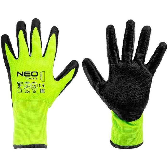 Утеплені робочі рукавички NEO розміру 9, нейлон з латексним покриттям, 4142X 97-613-9, виготовлені з нейлону з латексним покриттям. Вони мають високу стійкість до стирання (від 0 до 4) 4, стійкість до порізів гострими предметами (від 0 до 5) 1, стійкість до розриву (від 0 до 4) 4 та стійкість до проколу (від 0 до 4) 2. Вони також відрізняються стійкістю до порізів відповідно до EN ISO 13997 X. Рукавички добре сидять на руці. Вони можуть використовуватися для всіх видів транспортування, переміщення, зберігання, складальних робіт, виробництва дрібних деталей, DIY, автомобілебудування та садівництва. Вони захищають руки від холоду, бруду, подряпин, відбитків та шкідливих умов праці. При правильній конструкції - запобігає вислизанню інструментів з рук. Маркування CE на відповідність стандартам EN 388, 22242X та EN511, що забезпечує захист від холоду, є гарантією безпеки, що підтверджує, що продукт марки NEO відповідає всім вимогам СЕ.