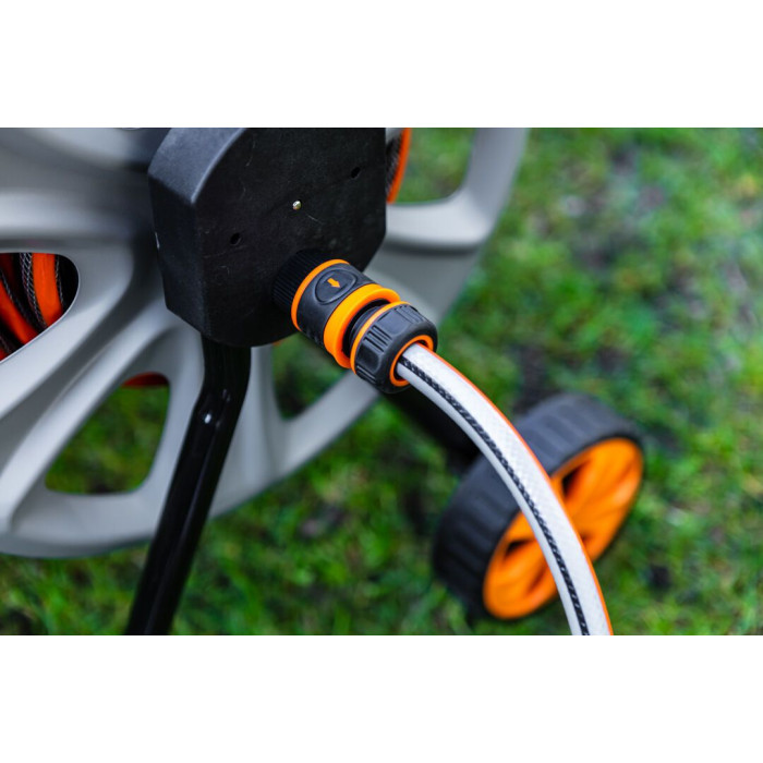 6-слойный садовый шланг из гибкого ПВХ, армированный полиэфирной нитью, с двумя оплетками (крест и трико). Прекрасно подходит для ухода за малыми и большими садовыми участками, включая очистку уличной мебели и инструментов, независимо от времени года. Устойчив к накоплению водорослей и УФ-лучей и пригоден для контакта с пищевыми продуктами благодаря слою Food Safe. Удобен в использовании благодаря системе против скручивания