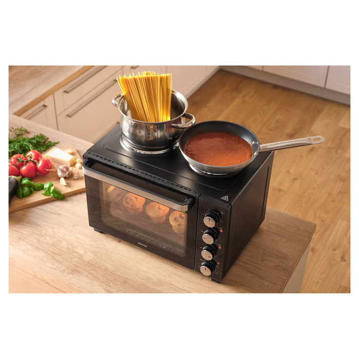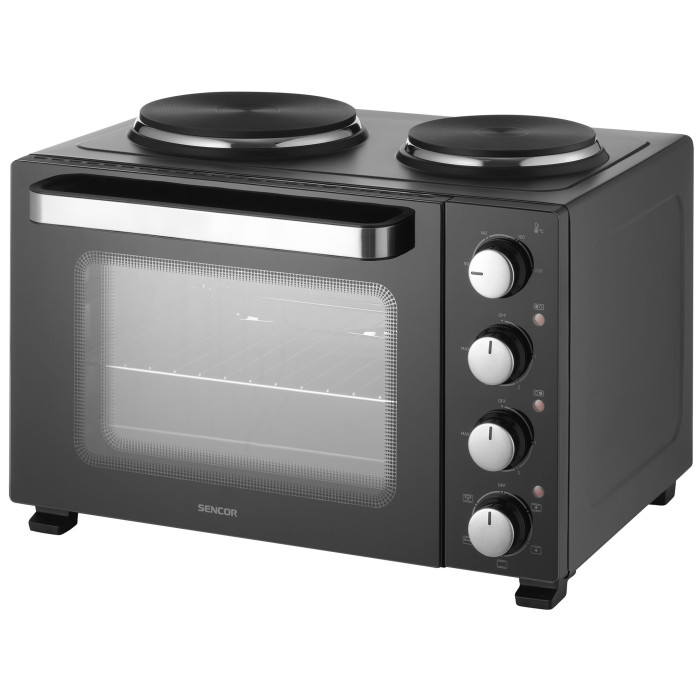 Електрична духовка Sencor SEO 3500BK поєднує функції повноцінної печі та варильної поверхні з двома конфорками. Об’єм 35 л і загальна потужність 3 200 Вт забезпечують ефективне приготування різноманітних страв — від супів до запеченого м’яса. Механічне керування з чотирма поворотними регуляторами дозволяє точно налаштувати температуру та режим роботи. Вбудоване підсвічування і світлові індикатори спрощують контроль процесу готування.