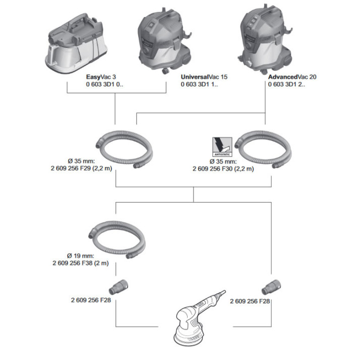 Універсальний перехідник. З'єднання шланга і електроінструменту, сумісний з будь-якими електроінструментами Bosch Green. Фіксуюча система: швидке з'єднання та від'єднання шланга. Силу всмоктування можна регулювати шляхом повороту кільця регулювання потоку повітря на переходнику. Відвернення кільця збільшує подачу повітря в систему і, відповідно, силу всмоктування інструменту.