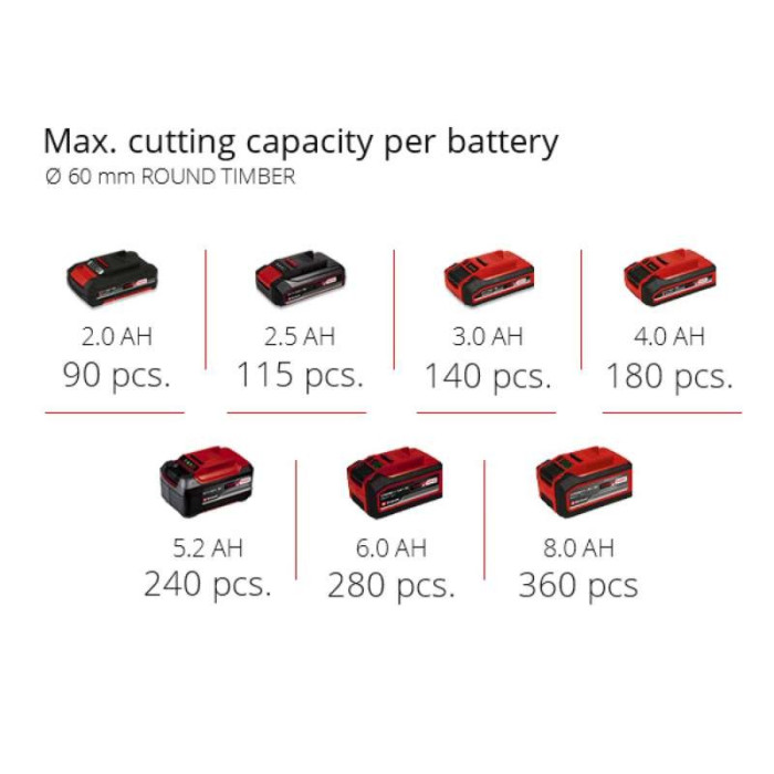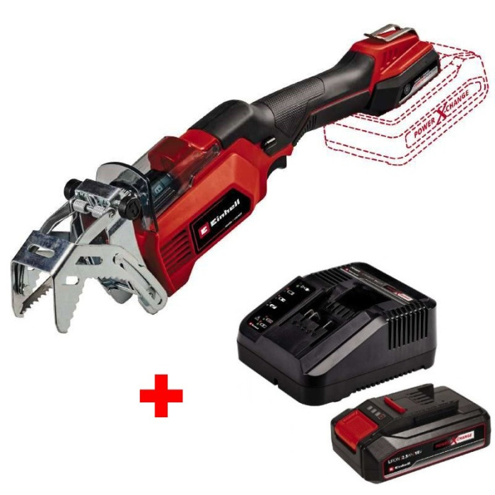 Einhell GE-GS 18/150 Li Kit — компактна акумуляторна шабельна пила-ножівка вагою 1,28 кг для обрізання гілок дерев і кущів діаметром до 100 мм без кронштейна та до 80 мм із кронштейном для гілок. Частота ходу 1500–2800 хв⁻¹ і хід 20 мм забезпечують чистий і швидкий різ однією рукою. Знімний кронштейн для гілок, безключова заміна полотна, захисна кришка тримача і двосторонній запобіжний вимикач роблять роботу безпечною і зручною. У комплекті акумулятор 18В 2,5 А·год, зарядний пристрій і два пильні полотна KWB (Швейцарія).