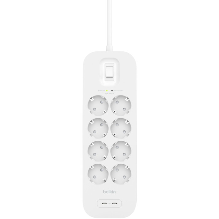 Удлинитель сетевой Belkin 2м, 8хТип, 16А, USB-С/USB-C 30Вт, фильтр, белый