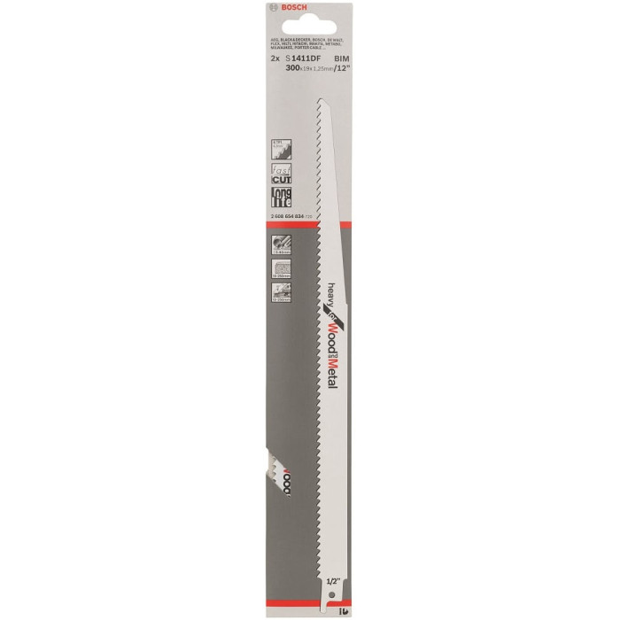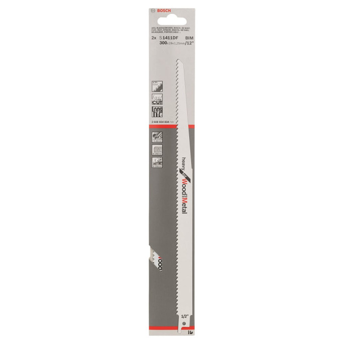 Шабельне полотно Bosch S 1411 DF Heavy for Wood and Metal довжиною 300 мм з фрезерованими, розведеними зубами з кроком 4,3 мм / 6 TPI, універсальним хвостовиком. Виготовлене з біметалу, полотно відрізняється поєднанням таких якостей як твердість і в'язкопружність. Легко розпилює лісоматеріали, у тому числі з цвяхами, деревні плити, ДСП товщиною до до 250 мм, склопластик і епоксидні матеріали — 60 мм.