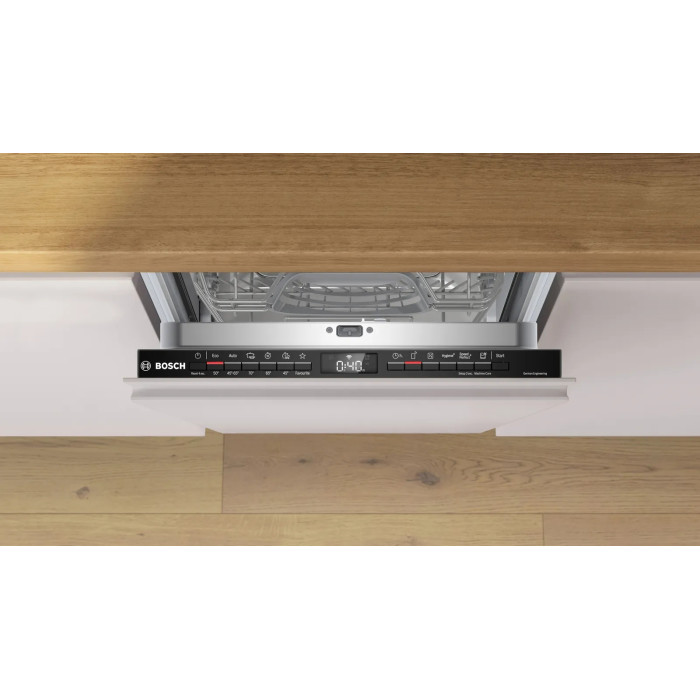Вбудована вузька посудомийна машина Bosch SPV4HMX14Q із підключенням Home Connect: дистанційний запуск, push-сповіщення, «Улюблене» та Easy Start. Опція SpeedPerfect+ скорочує тривалість циклу, Heat Exchanger дбайливо миє скло й фарфор, Self Cleaning Filter зменшує потребу в ручному очищенні фільтра. Стопори нижнього короба роблять завантаження зручнішим.