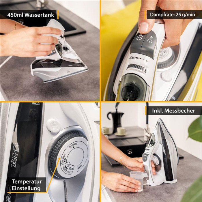 Праску можна використовувати як зазвичай на прасувальній дошці або вертикально для розвішування одягу за допомогою парового удару. Завдяки практичному замикаючому механізму базової станції праскою також можна керувати за допомогою кабелю. Керамічна підошва з антипригарним покриттям дозволяє прасці ковзати по всьому текстилю, не прилипаючи. Праска також самоочищається, має функцію захисту від крапель і накипу.
