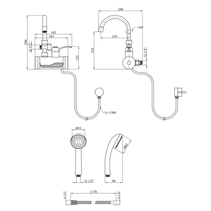 Кран, шланг для душа (1500 мм), дівертор, лійка для ручного душа, кріплення, інструкція.