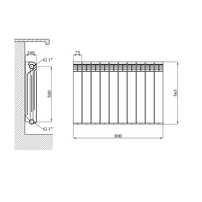 Монтаж радіатора виконується на стіну, а підключення здійснюється з бічного боку за допомогою різьби діаметром 1". Міжосьова відстань підключення становить 500 мм, що є стандартом для більшості установок. Радіатор використовує воду як теплоносій, і рекомендований водневий показник для ефективної роботи знаходиться в межах від 5 до 8 рН.