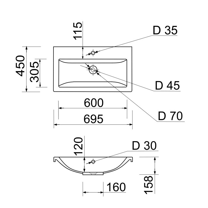 Раковина Adamant CERS має прямокутну форму, виготовлена зі штучного каменю з розмірами 695 x 450 x 158 мм та білим кольором. Накладний тип встановлення з отворами для змішувача та переливу дозволяє монтаж на тумбу. Матер... Читать далее...