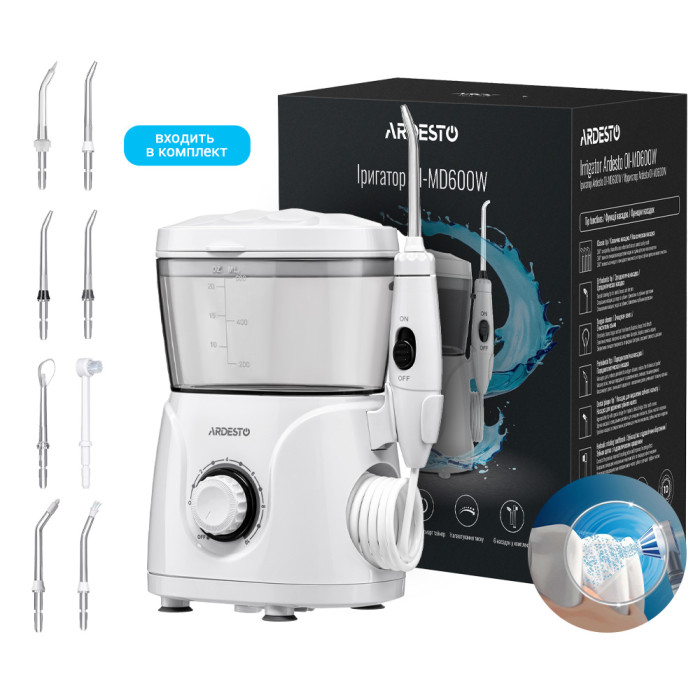 Іригатор ARDESTO стаціонарний, чаша 600 мл, від мережі , 8 насадок, білий