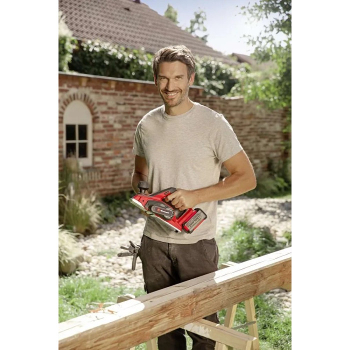 Рубанок акумуляторний Einhell TE-PL 18/82 Li – Solo серії Expert має високу продуктивність, великий робочої глибиною (до 2 мм) і глибиною вибірки (фальца) до 8 мм, дозволяючи працювати швидко і ефективно. Рубанок має ергономічний дизайн, а так само наявність обмежувача глибини вибірки, паралельного упору, можливості вибору напрямку пиловидалення вліво або вправо, наявність відділення для зберігання запасних ножів, виконаного безпосередньо в корпусі інструменту. Автоматичний захист леза і зручні м'які ручка забезпечують оптимальну безпеку при роботі з рубанком. Акумулятор і зарядний пристрій не входять до комплекту поставки.