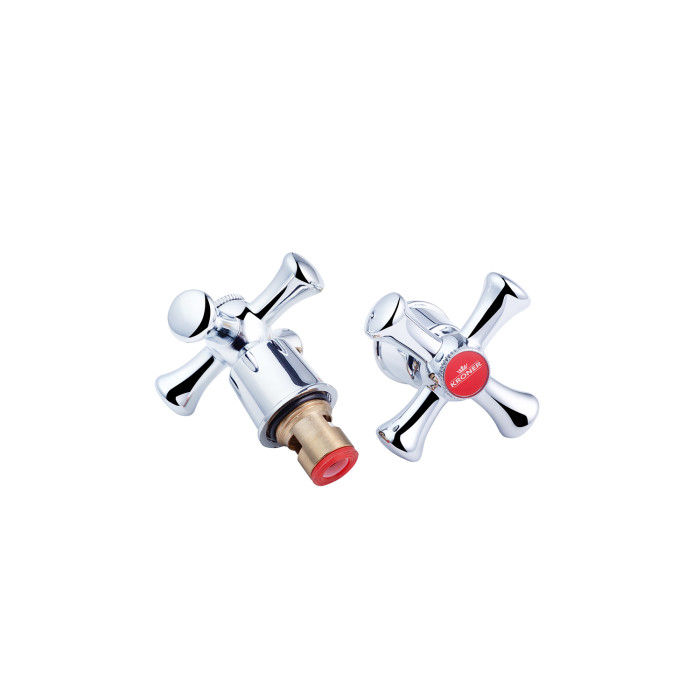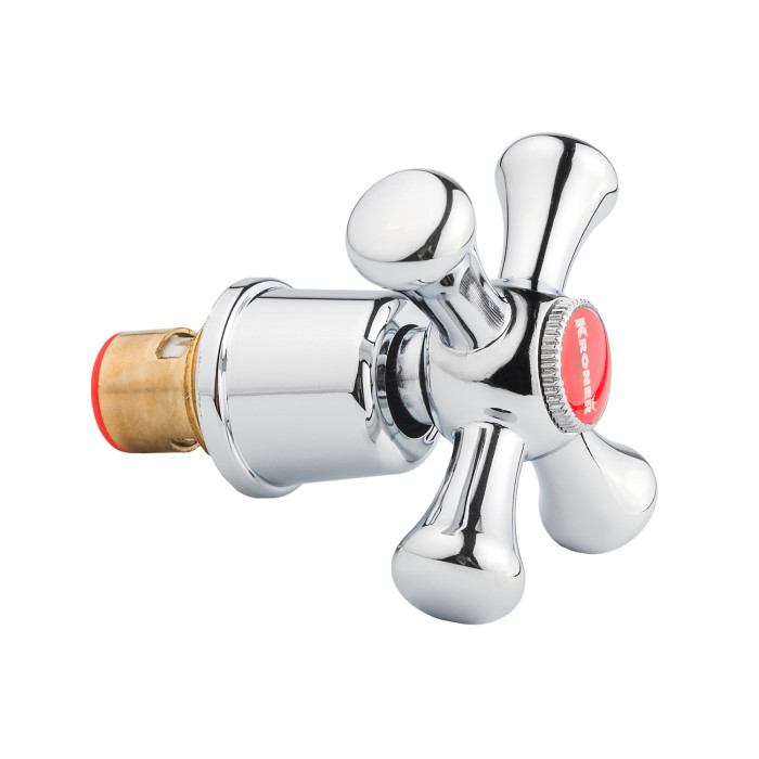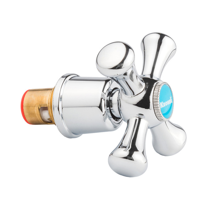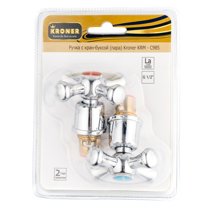 Ручки з керамічною буксою Kroner KRM - C985 (пара) являє собою два хромованих вентиля. Вони виготовлені з високоякісної латуні, тому мають тривалий термін експлуатації та стануть чудовою заміною зношеним або неякісним буксам. Використовуються як запірний механізм для відкриття/закриття та регулювання потоку води, що подається з водопроводу. Для встановлення передбачено діаметр підключення 1/2".