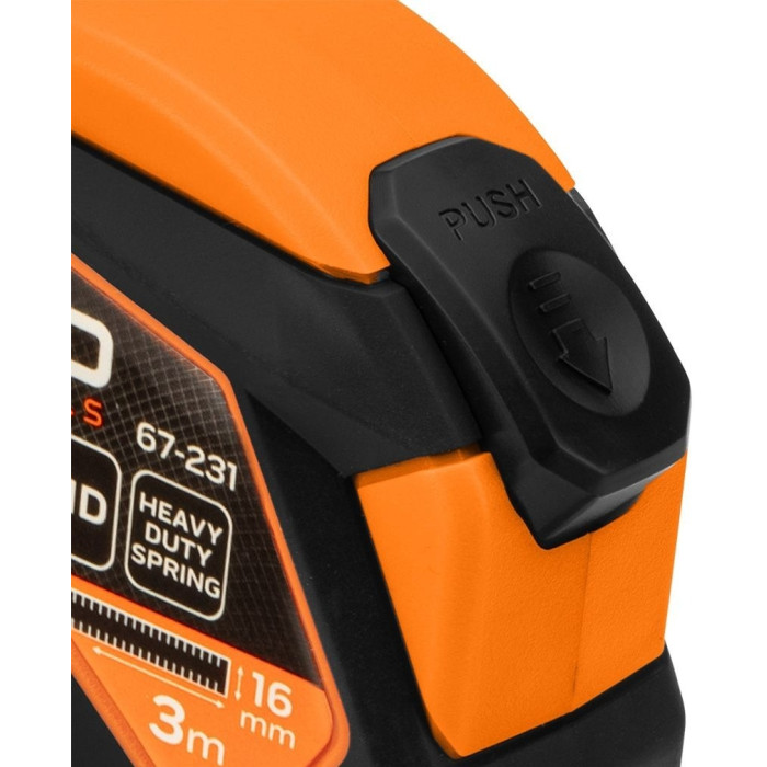 Рулетка сталева 3 м х 16 мм, автоблокування, кнопка стоп, магніт 67-231 від NEO TOOLS - це інструмент з рулеткою довжиною 3 м і шириною 16 мм. Оснащений практичною функцією автоматичної зупинки, яка запобігає самостійному втягуванню рулетки в розгорнутому стані, а також можливістю використання фіксуючого пристрою. Магніт сприяє кращій стабілізації рулетки, а збільшений друк впливає на швидкість зчитування результатів вимірювань.