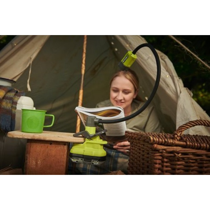 Ліхтар Ryobi RLCF18-0, ONE+ 18В, 400 лм, 2 режими, гнучка штанга, фокусування лінзи (без АКБ та ЗУ). Будучи частиною системи Ryobi ONE+™, що включає понад 200 акумуляторних інструментів, бездротовий світлодіодний світильник Flex Light Ryobi 18V ONE+™ RLCF18-0 ідеально підходить як для побутових цілей, так і для домашніх майстрів при роботі з невеликими предметами крупним планом і там, де освітлення на близькій відстані. Світлодіодна лампа випромінює 400 люмен світла, а гнучка 40-сантиметрова штанга дозволяє легко спрямовувати світло туди, де воно необхідне. Зручна затискна основа дозволяє закріпити ліхтар на будь-якій поверхні завтовшки до 38 мм. Виберіть один із двох режимів яскравості для максимального часу роботи або інтенсивності світла та охоплення, є фокусування променя та режим розсіяного світла.