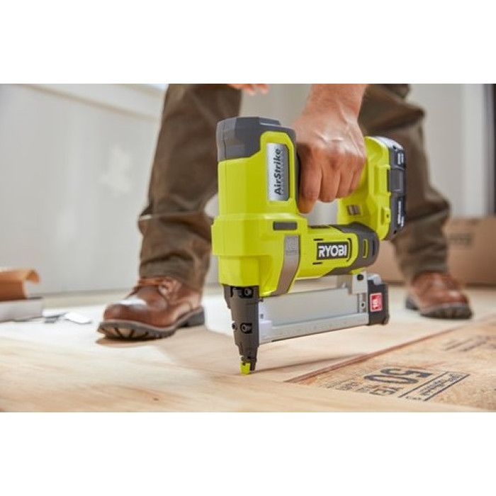 Гвоздестрел 18G с технологией AirStrike обеспечивает комфорт при питании от батареи, устраняя необходимость в компрессоре и громоздких шлангах для сжатого воздуха. Гвоздезабивной пистолет имеет регулировку глубины без использования инструментов, чтобы предотвратить повреждение поверхности.