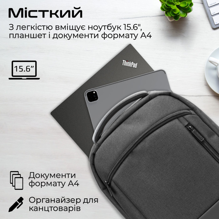 Місткий: Рюкзак має внутрішній об’єм — 11 л. Він легко вміщує ноутбук 15.6", планшет, документи формату А4, контейнер з їжею, спортивний одяг та інші повсякденні речі.