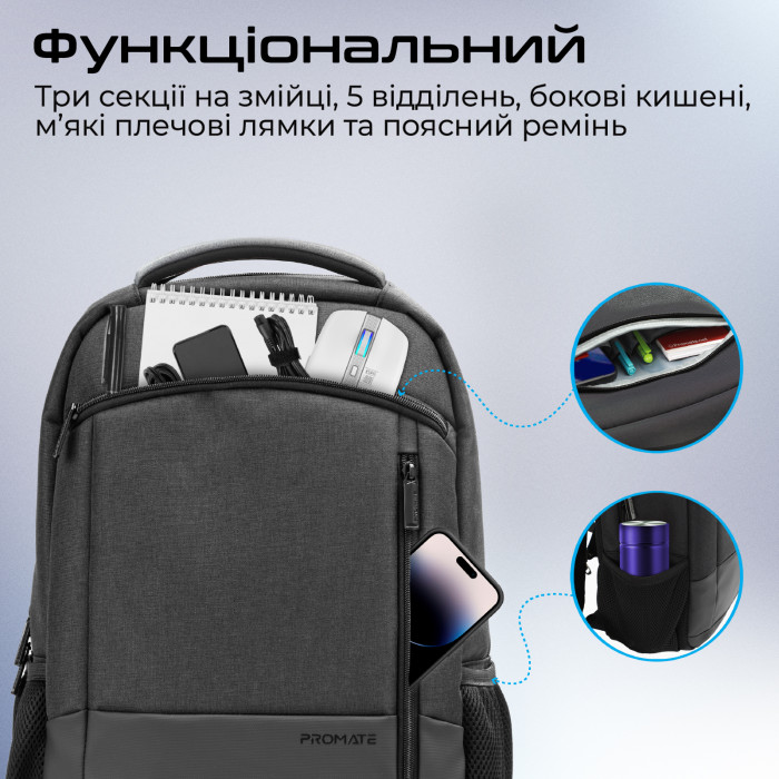 Promate Satchel-BP — це поєднання практичності та стилю, зручної посадки та продуманості деталей. Носи з собою всі необхідні речі та рухайся з комфортом у міському потоці.