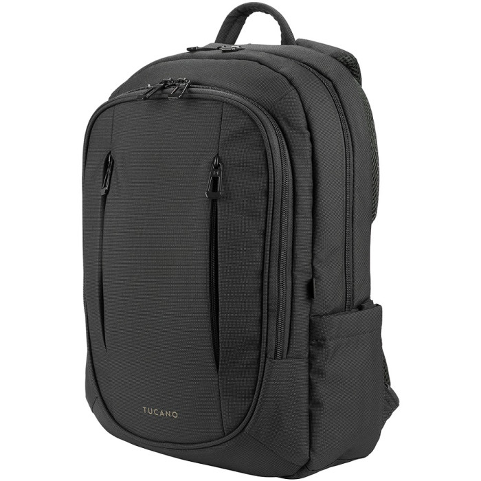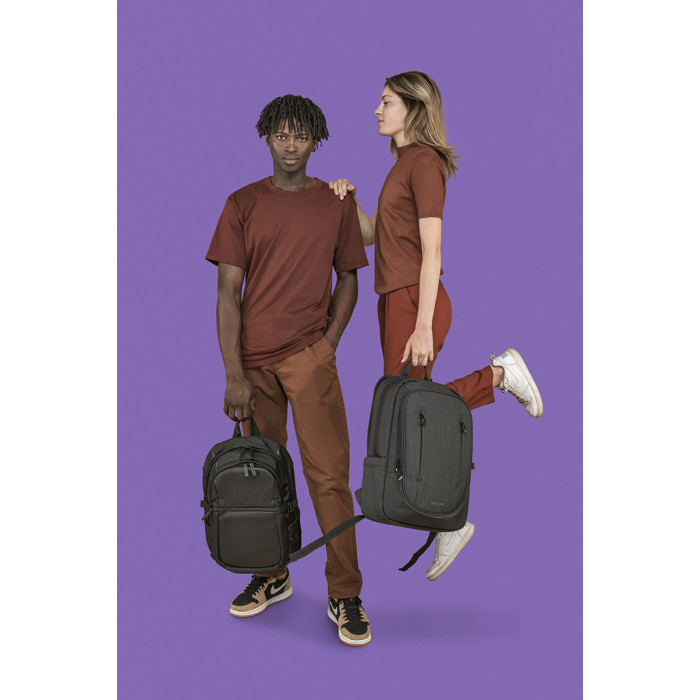Бізнес-рюкзак стаорено із двоколірного матеріалу, виготовленого з переробленого пластику,і оснащений фірмовою системою AGS від Тукано, AGS це еластична система підвіски на плечових ременях, розроблена для зменшення навантаження на плечі та спину.