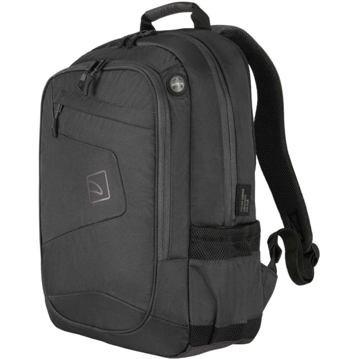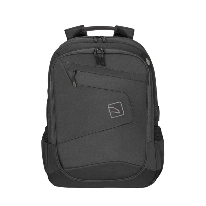 Повсякденний рюкзак Tucano Lato 15 в діловому стилі зі спортивними нотками розраховано для 16-дюймового MacBook Pro та 15,6-16 дюймових ноутбуків. Виготовлений із матеріалів з використанням переробленого пластику. Організована передня зовнішня кишеня та маленька кишеня для аксесуарів, обидві на блискавці. Невеликий спеціальний отвір дозволяє виводити навушники. Велике внутрішнє відділення оснащене м'якою подвійною кишенею з фіксуючим ремінцем на липучці (окрема кишеня для ноутбука і окрема кишеня для планшету). Збоку дві еластичні сітчасті кишені для пляшок, парасольок і предметів подібного розміру. Задня сторона, з ергономічною спинкою та регульованими м'якими плечовими лямками, оснащена паском для кріплення рюкзакая на ручці валізи.