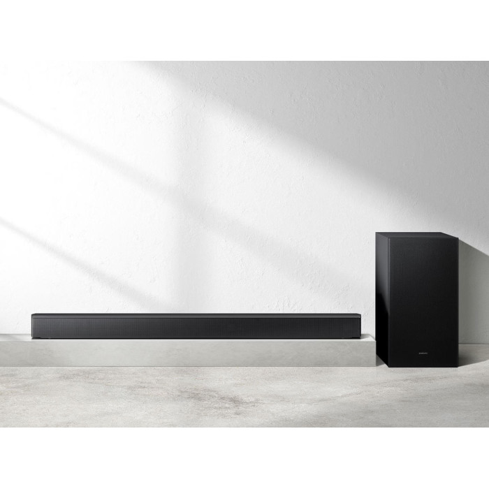 Samsung HW-B650D – потужний саундбар 3.1 із загальною вихідною потужністю 430 Вт та бездротовим сабвуфером. Підтримує Dolby 5.1, DTS Virtual:X, Bass Boost, Adaptive Sound та Game Mode для об’ємного й насиченого звучання.