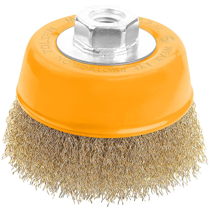 Чашкова щітка Tolsen Профі 77601 діаметром 75 мм призначена для відносно м’якої обробки поверхонь. Використовується з кутовими шліфувальними машинами для видалення іржі, фарби та лаку з металевих поверхонь. Оснащена сталевим латунованим дротом Ø0,3 мм, що забезпечує делікатне очищення без надмірного пошкодження матеріалу. Різьблення M14x2 дозволяє легко закріпити щітку, а максимальна швидкість 12 500 об/хв гарантує ефективну роботу.