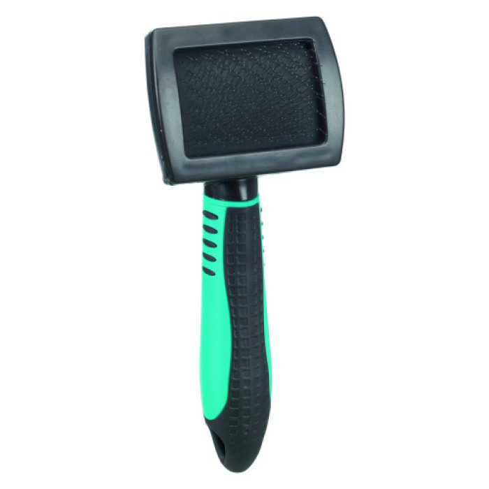 Ця щітка Trixie має м’яку щетину з дроту та пластикову прогумовану ручку.Підходить для хвилястої шерсті, довгої шовковистої, коротко- та жорсткошерстих порід.