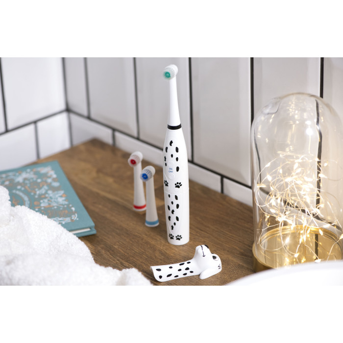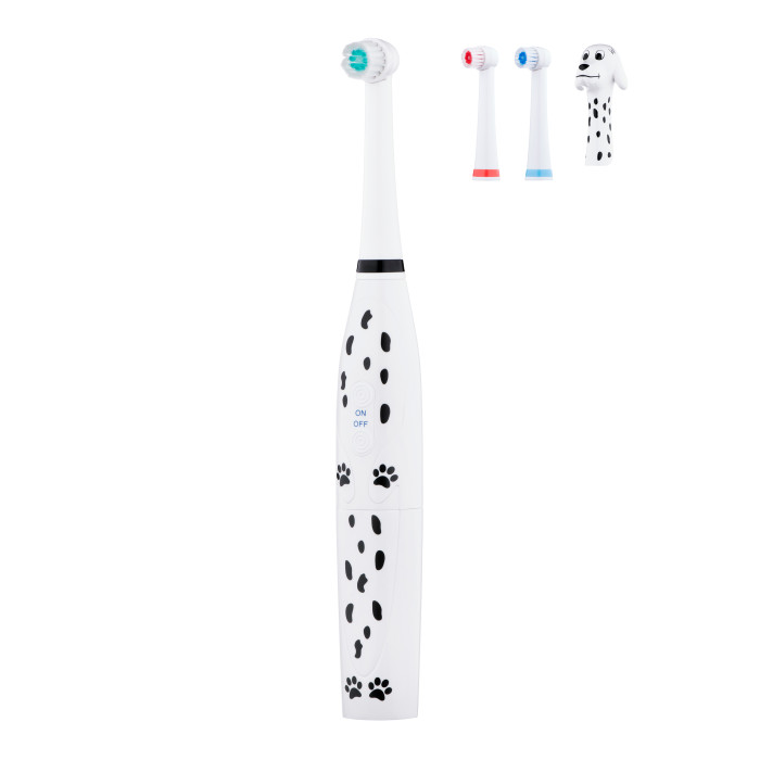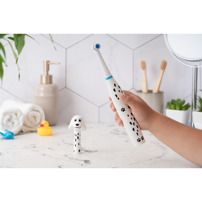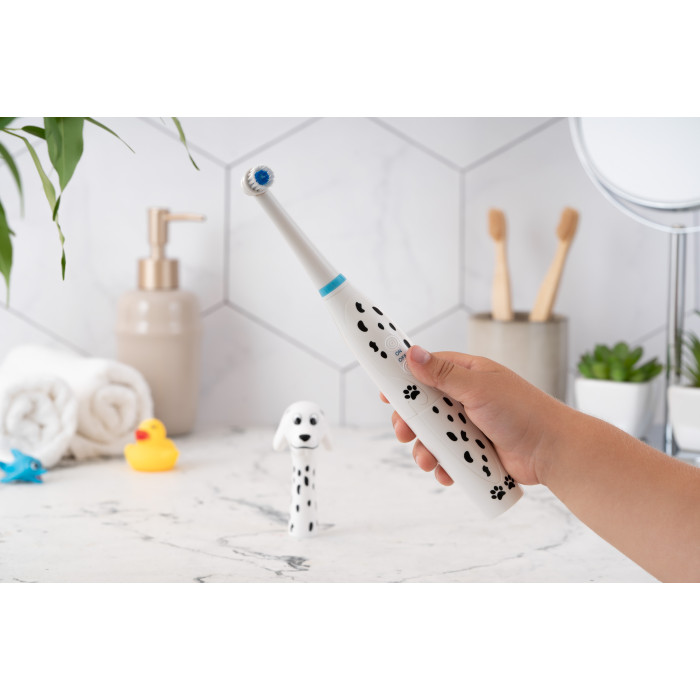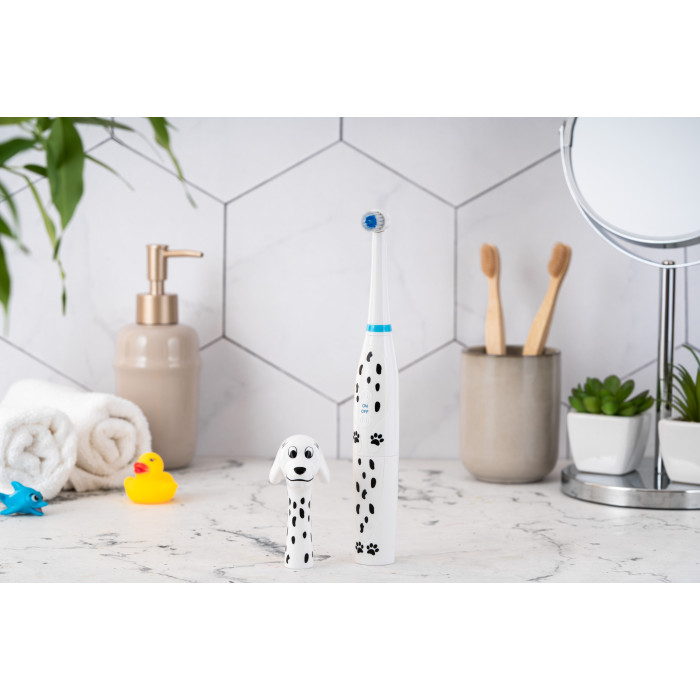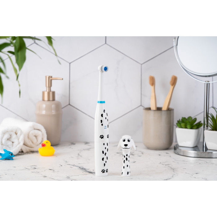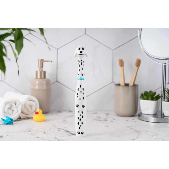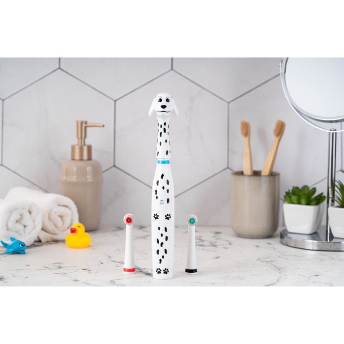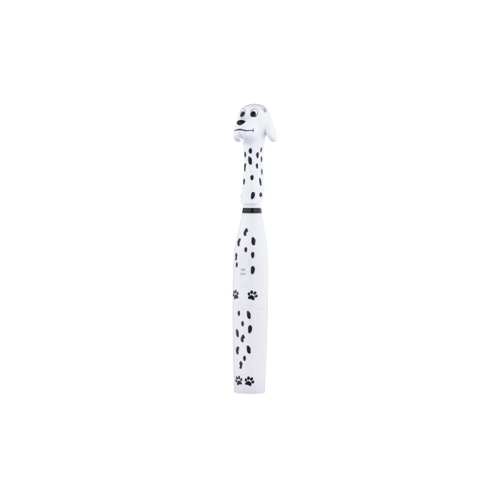 Дитяча електрична зубна щітка ARDESTO ETB-003DOG із унікальним дизайном у вигляді милого песика-далматинця перетворює процес чищення зубів на захопливу гру. М’яка щетина ніжно очистить зуби дитини, забезпечуючи ретельний та бережний догляд. Клас захисту IPX6 – щітку можна мити під струменем води. Працює від двох батарейок стандарту ААА, їх ресурсу вистачить на декілька тижнів безперервної роботи. Для дітей віком від 5 років.
