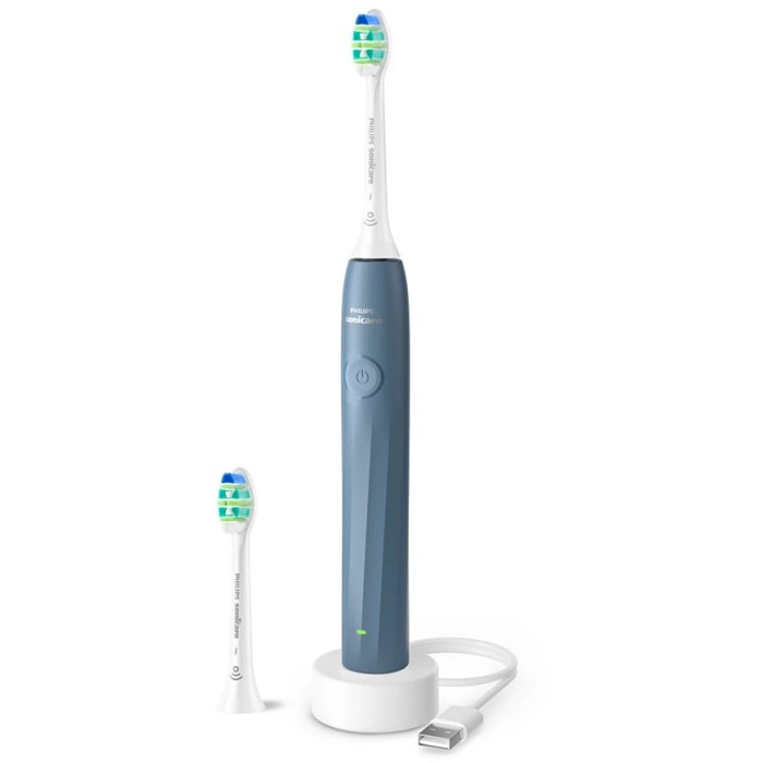 Електрична зубна щітка Philips Sonicare 2100 забезпечує щоденне звукове чищення з двома рівнями інтенсивності. Режими підходять для чутливих зубів та для стандартного догляду. Акумулятор працює до 14 днів без підзаряджання. У комплекті — дві насадки InterCare та USB-зарядний пристрій, колір — морської хвилі.