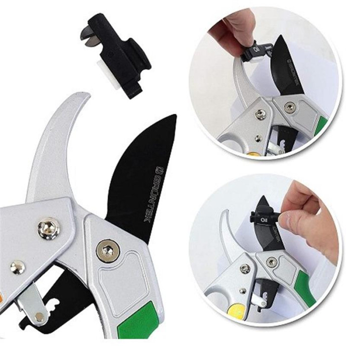 Губка для масла і точилка забезпечують своєчасний догляд за лезом сікатора і дозволяє йому завжди залишатися чистим і гострим. Ергономічні ручки з покриттям з ПВХ - надійно фіксуються в руці і не ковзають.