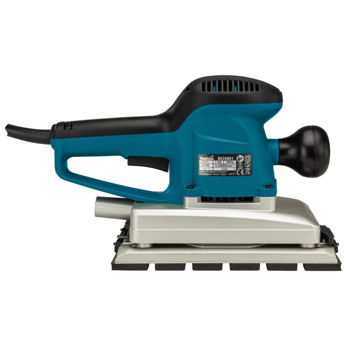 Шліфмашина вібраційна Makita BO4901 — інструмент потужністю 330 Вт з платформою 115×229 мм для шліфування великих площ деревини, металу та пластику. Частота коливань регулюється від 8000 до 20000 кол/хв (4000–10000 об/хв), амплітуда 2,6 мм забезпечує ефективне зняття матеріалу. Вбудована система збору пилу через шліфувальну пластину та можливість підключення пилососа зменшують запилення робочої зони. Ергономічна конструкція з великими затискними важелями полегшує швидку зміну шліфувального паперу. Вага 2,7 кг робить пристрій зручним для тривалої роботи.