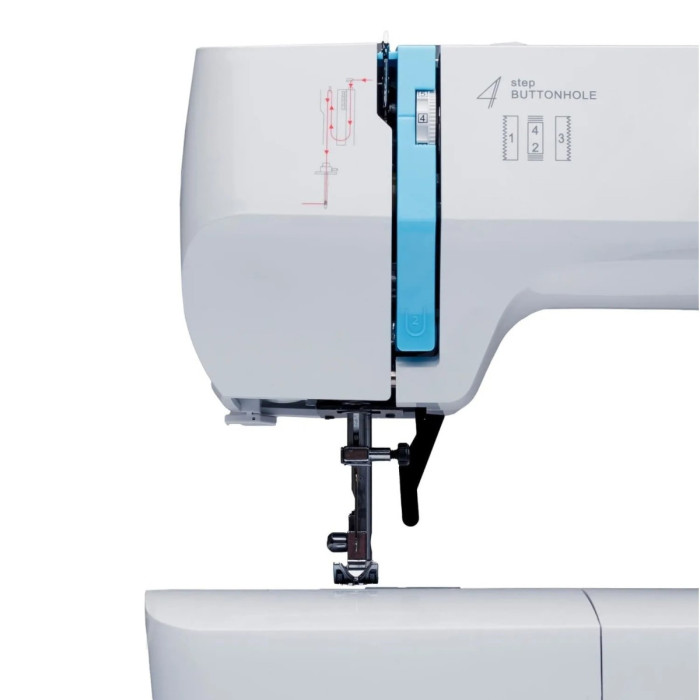 шиття подвійною голкою, швидка заміна лапок/універсальне кріплення, дворівневий підйом лапки/до 14 мм, посилений нижній транспортер, працює з різними видами тканин, система автоматичного намотування шпульки, клавіша реверсу шиття для закріплення строчки,