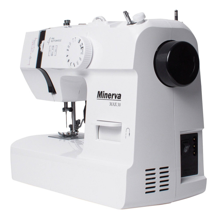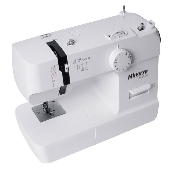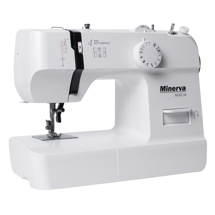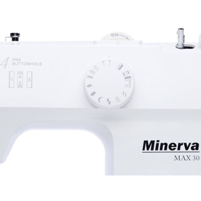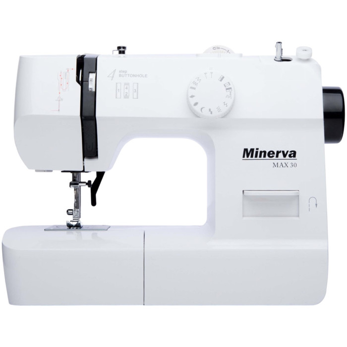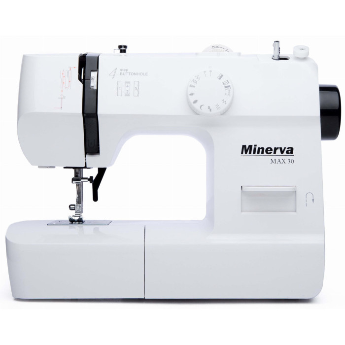 MINERVA Max 30 - нова практична модель швейної машинки компактної серії, оснащена класичним вертикальним човниковим пристроєм і яскравим світлодіодним підсвічуванням. Призначена для шиття і ремонту одягу. Виконує 13 видів строчок. Висока потужність, як для швейних машин компактної серії гарантує високу якість шиття на цупких тканинах.