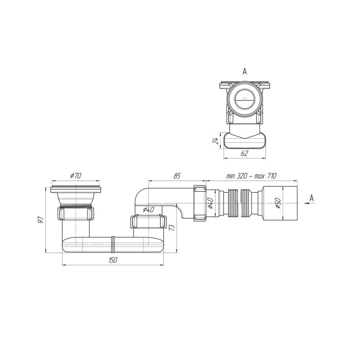 Сифон, різьбовий випуск, гофротруба, нержавіюча сітка