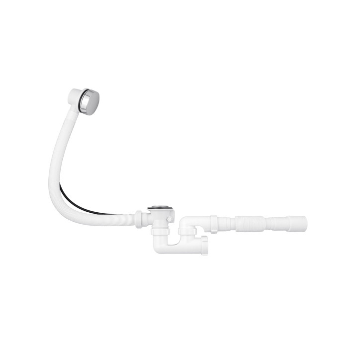 Сифон Agua BS05P з різьбовим випуском 1 1/2" і переливом напівавтомат, з ревізією, з тросом завдовжки 580 мм і хромованою ручкою пластмасовою. Для підключення до каналізації комплектується гнучкою трубою 40х40/50. Сітка випуску і ковпачок заглушки випуску з нержавіючої сталі. Робочий діапазон температур від 0 до +95°C.