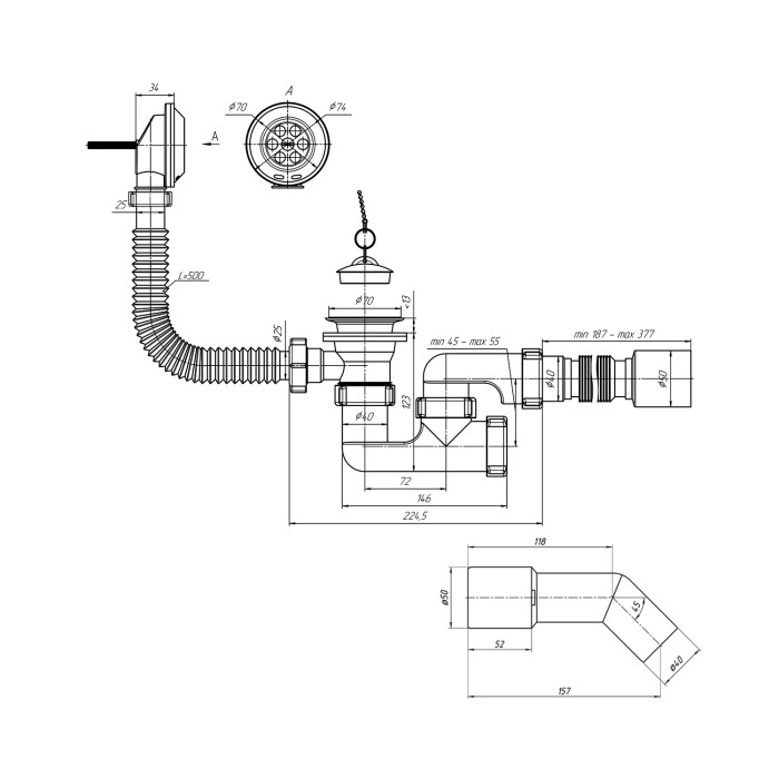 Сифон, різьбовий випуск, гнучкий круглий перелив, ревізія, гофротруба, нержавіюча сітка