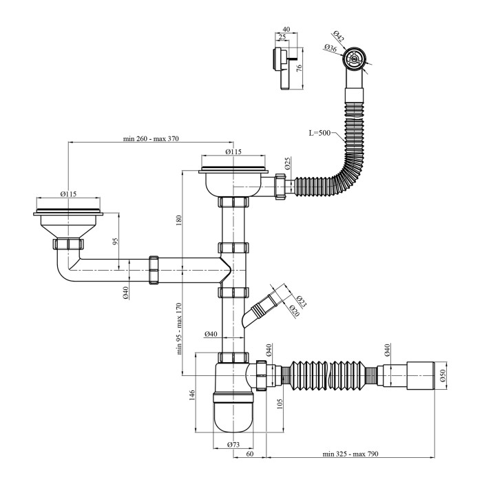 Сифон двойной, резьбовой выпуск, отвод для подключения стиральной машины, гибкий прямоугольный перелив, гофротруба, нержавеющая сетка