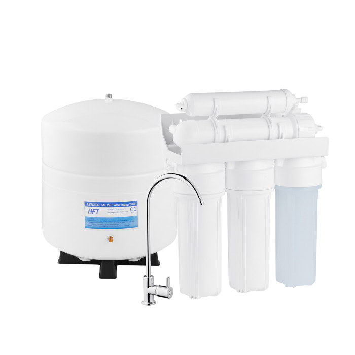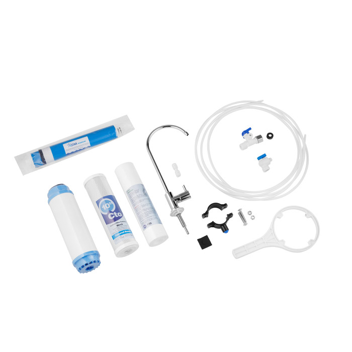 Фільтр у зборі, 5 картриджів, накопичувальний бак, одинарний кран, комплект для підключення та інструкція.