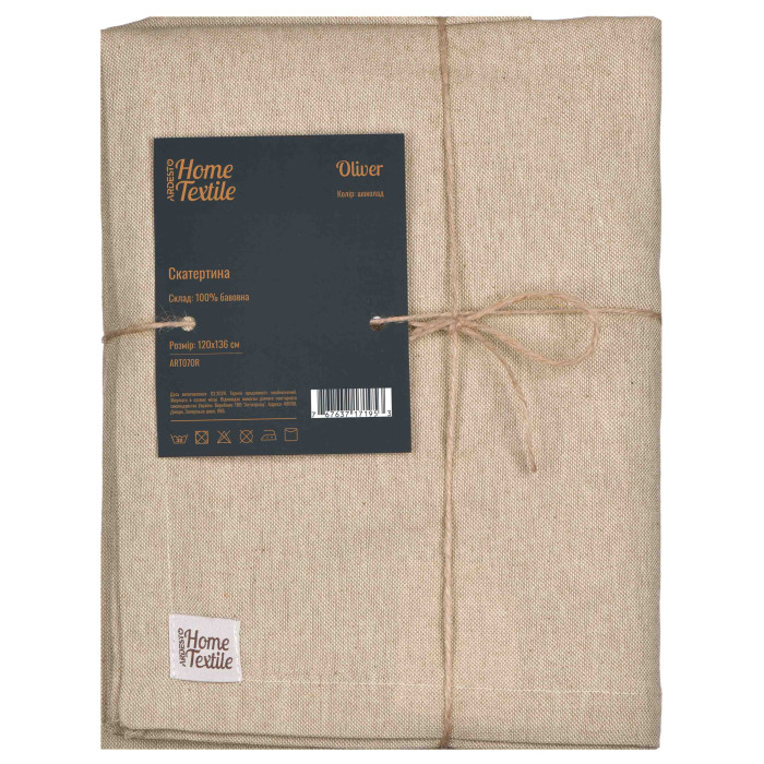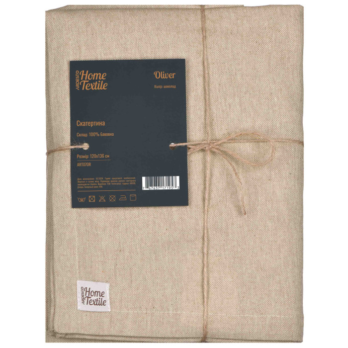 Стильна скатертина Oliver вдало доповнить інтер’єр їдальні чи кухні. Вироблена зі 100 % бавовни, вона вирізняється зносостійкістю та легкістю щодо догляду, проте для збереження первинного вигляду все ж варто зважати на рекомендації: прати в машині за делікатного режиму (30 °C); не сушити в сушильній машині, а тільки у вертикальному положенні; прасувати за температури до 150 °C; також заборонено відбілювання та хімчистка. Завдяки розміру 120 × 136 см скатертина згодиться для більшості стандартних столів, а з огляду на елегантний колір (шоколад) вона гармонійно пасуватиме до різних стилів сервірування.