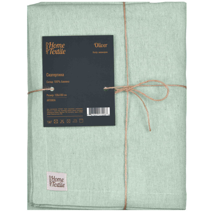 Стильна скатертина Oliver вдало доповнить інтер’єр їдальні чи кухні. Вироблена зі 100 % бавовни, вона вирізняється зносостійкістю та легкістю щодо догляду, проте для збереження первинного вигляду все ж варто зважати на рекомендації: прати в машині за делікатного режиму (30 °C); не сушити в сушильній машині, а тільки у вертикальному положенні; прасувати за температури до 150 °C; також заборонено відбілювання та хімчистка. Завдяки розміру 136 × 180 см скатертина згодиться не тільки для стандартних, а й великих столів, а з огляду на яскравий колір (аквамарин) вона допоможе додати яскравий акцент сервіруванню.